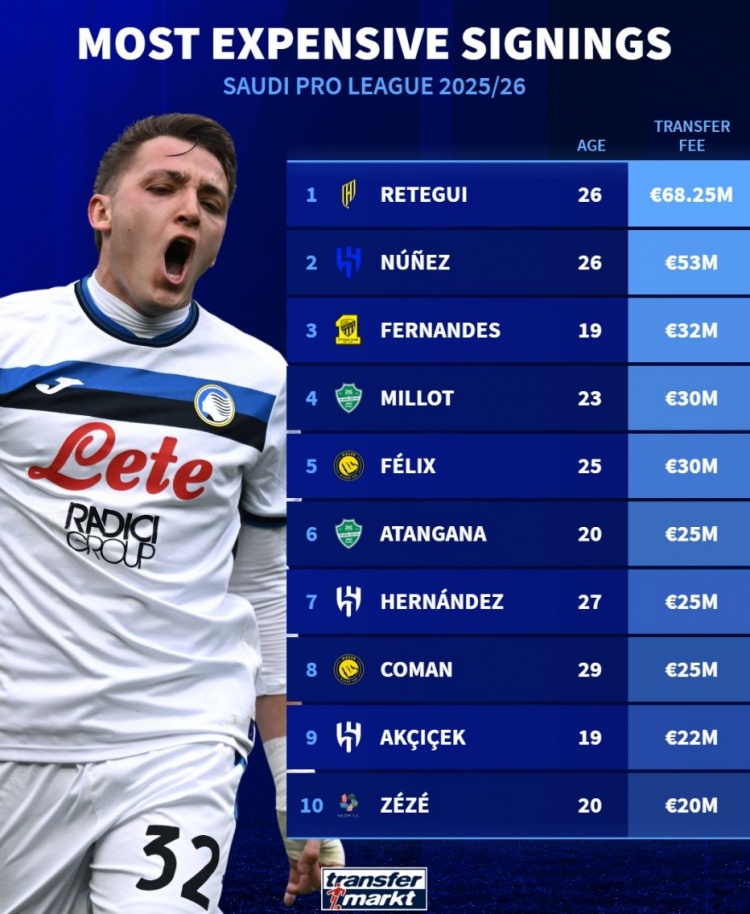 9月12日讯 沙特今夏转会窗已经关闭,《转会市场》也统计了沙特今夏最贵引援榜,雷特吉居首,5人年龄不高于23岁。