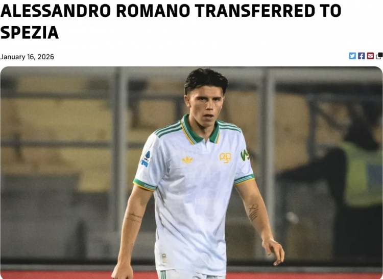当地时间本周五,罗马俱乐部在官网发布公告称:“罗马俱乐部宣布,亚利桑德罗·罗马诺被租借至斯佩齐亚。这名19岁的瑞士中场在2026年1月6日罗马对莱切的意甲联赛中上演了罗马一线队首秀。祝你好运,亚利桑德罗!”